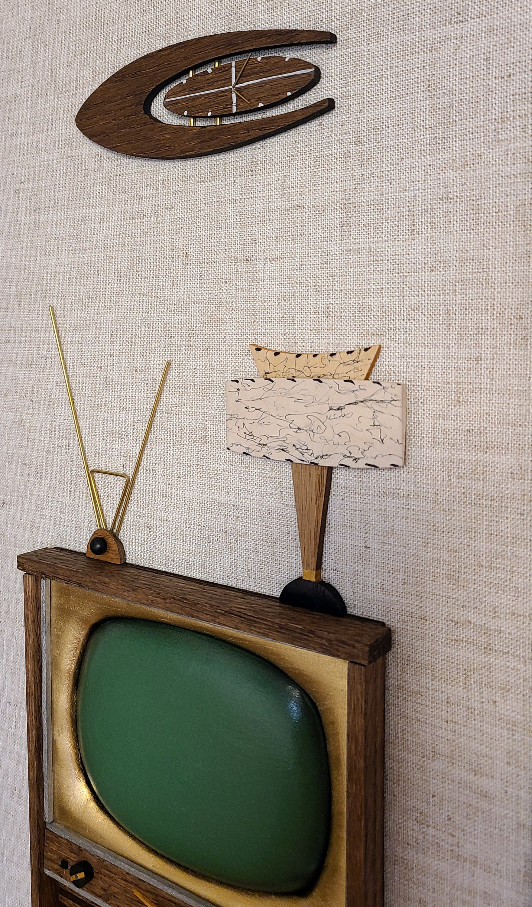 Several types of wood used. Vintage speaker grill cloth used on TV set.