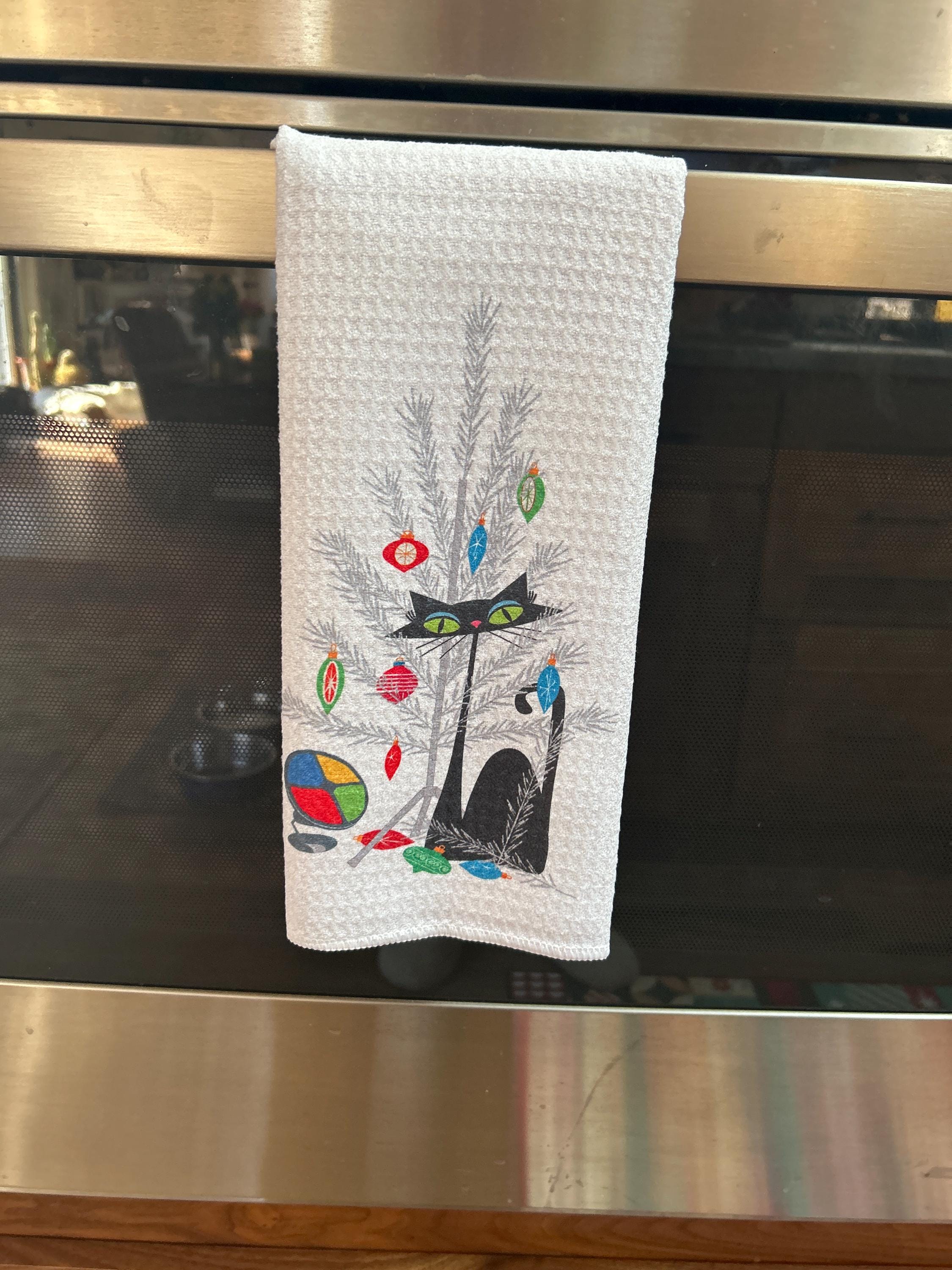 When I saw the Atomic Cat with the Silver Christmas Tree and Light Wheel—wow! Memories of our late 1960s tree and a must have! Nicely wrapped with a lovely note. Highly recommend these towels and this shop!