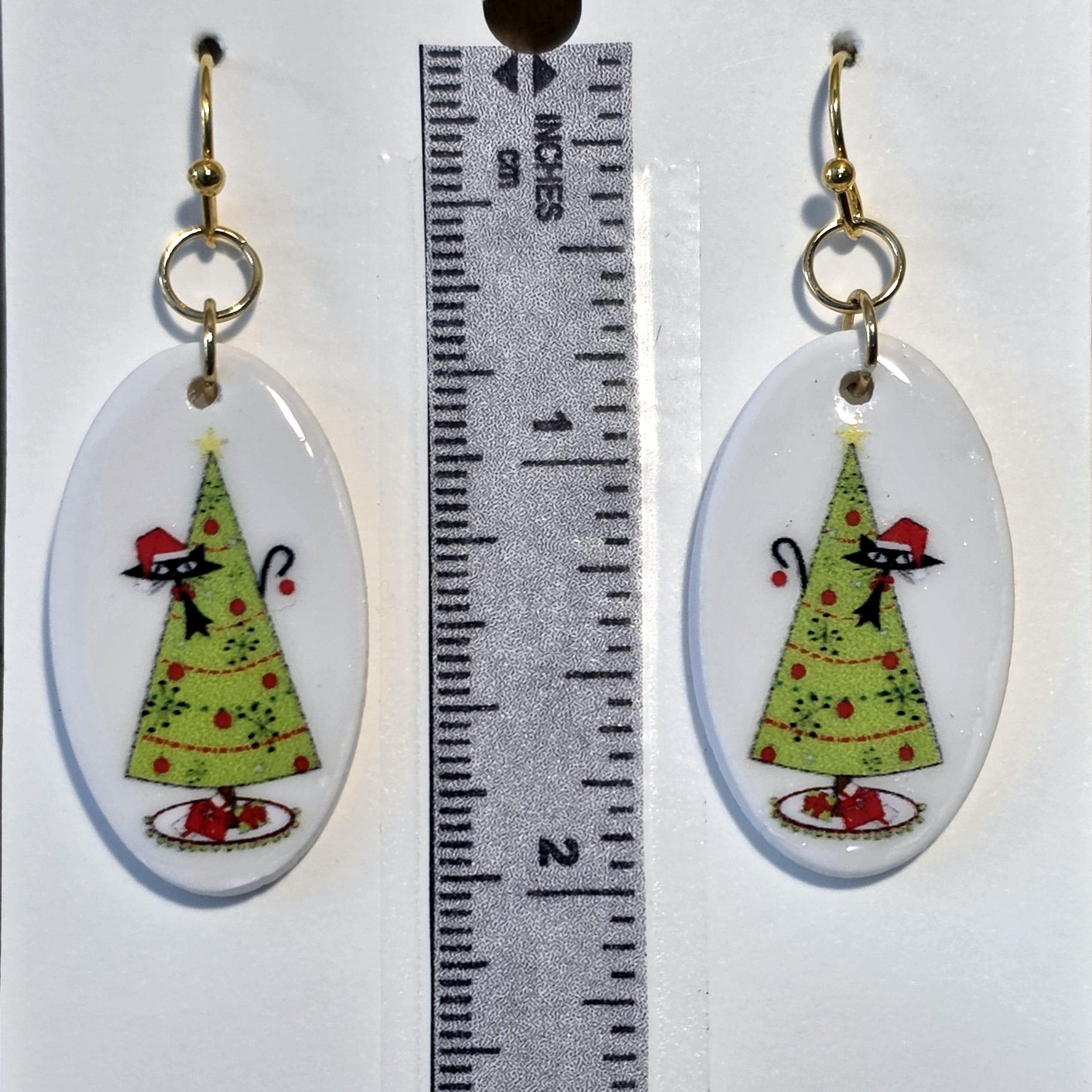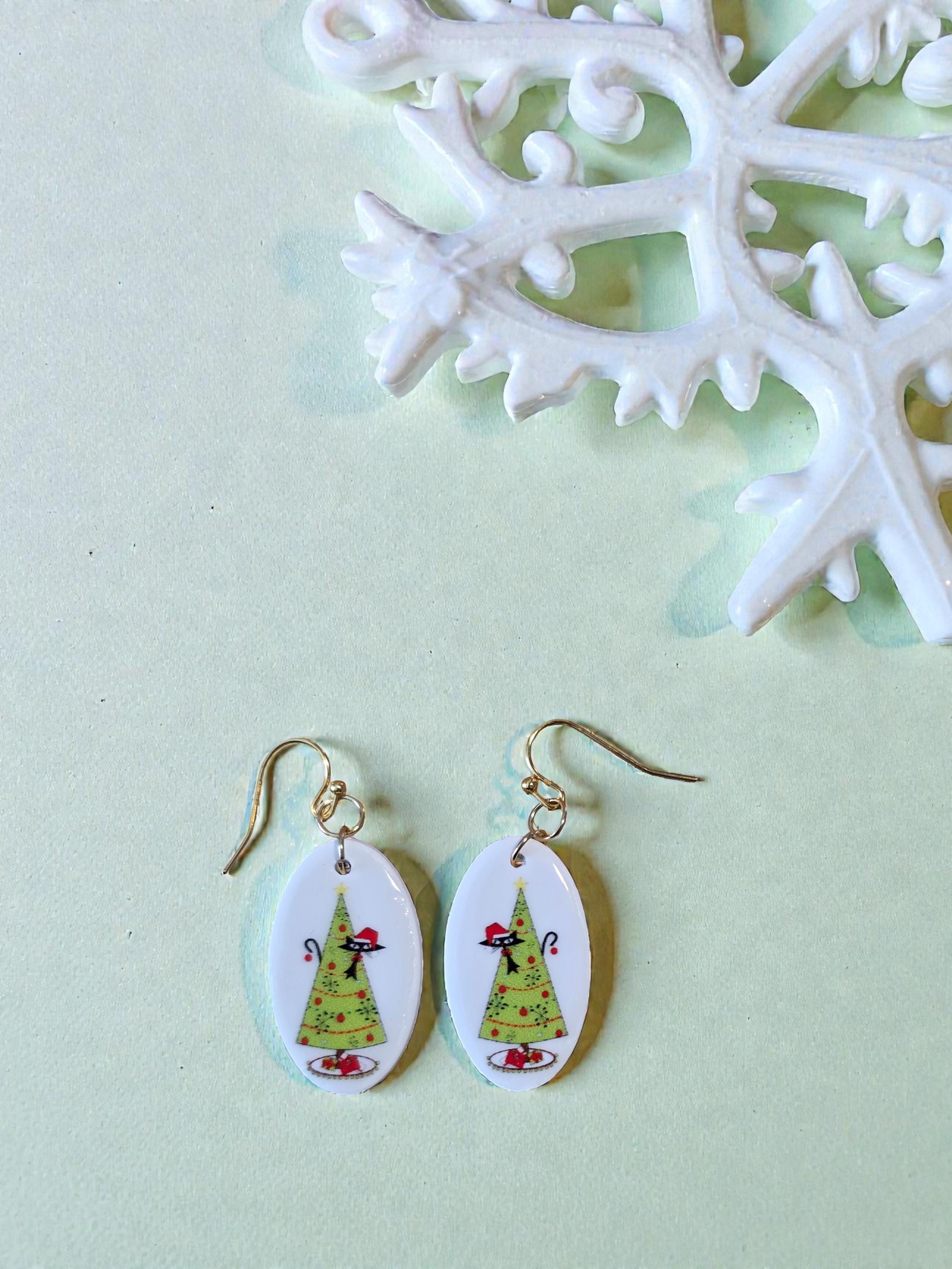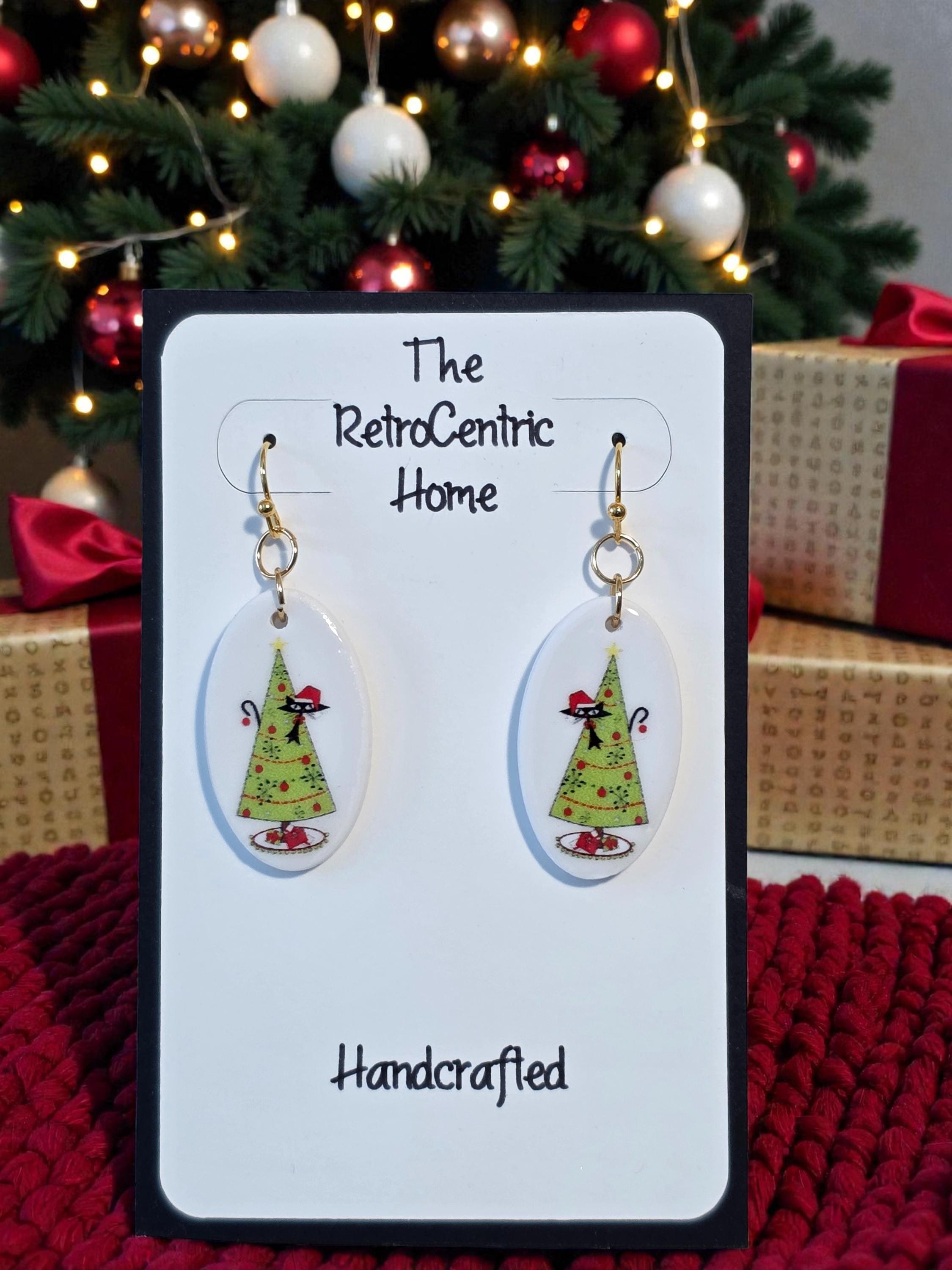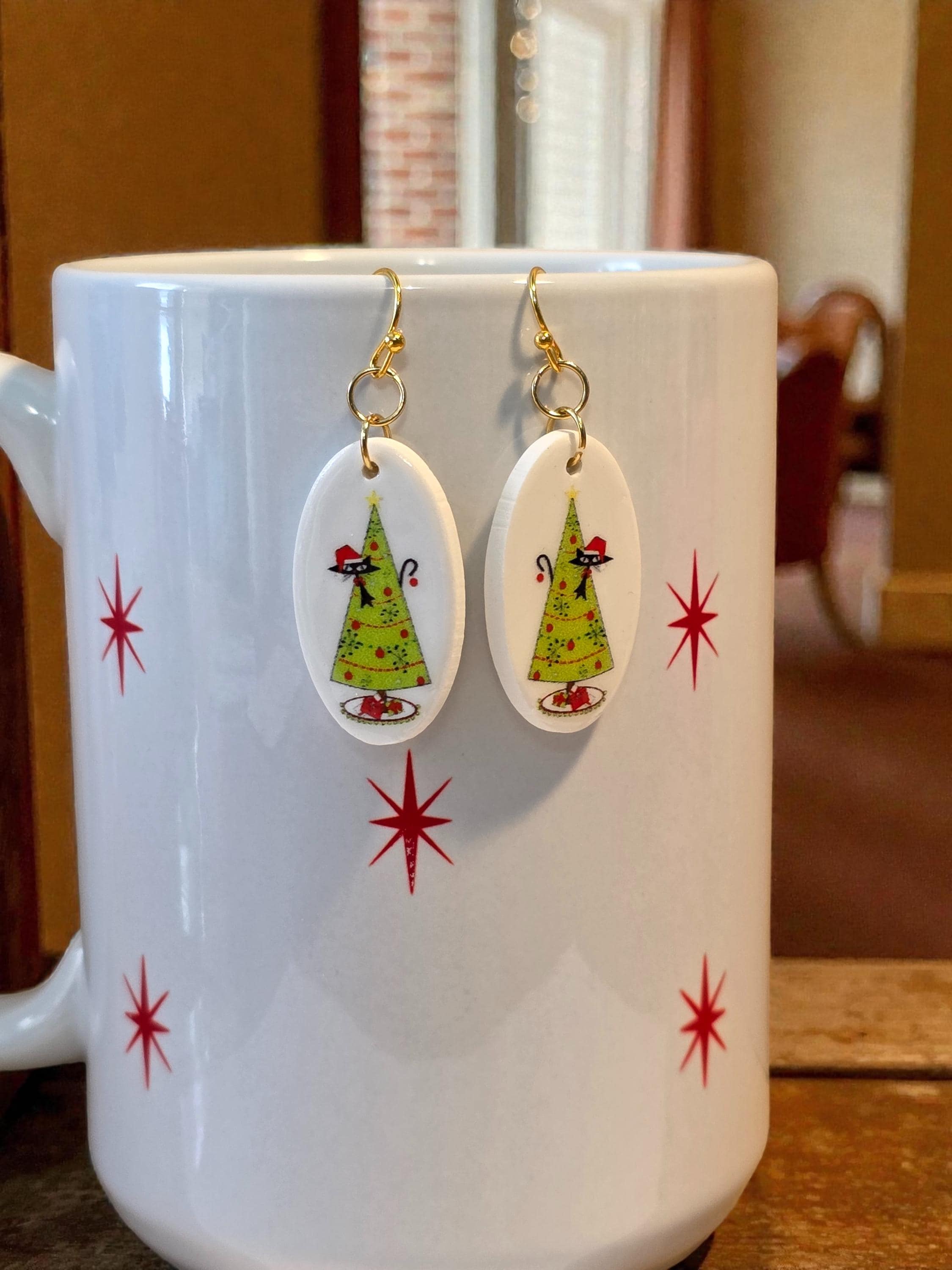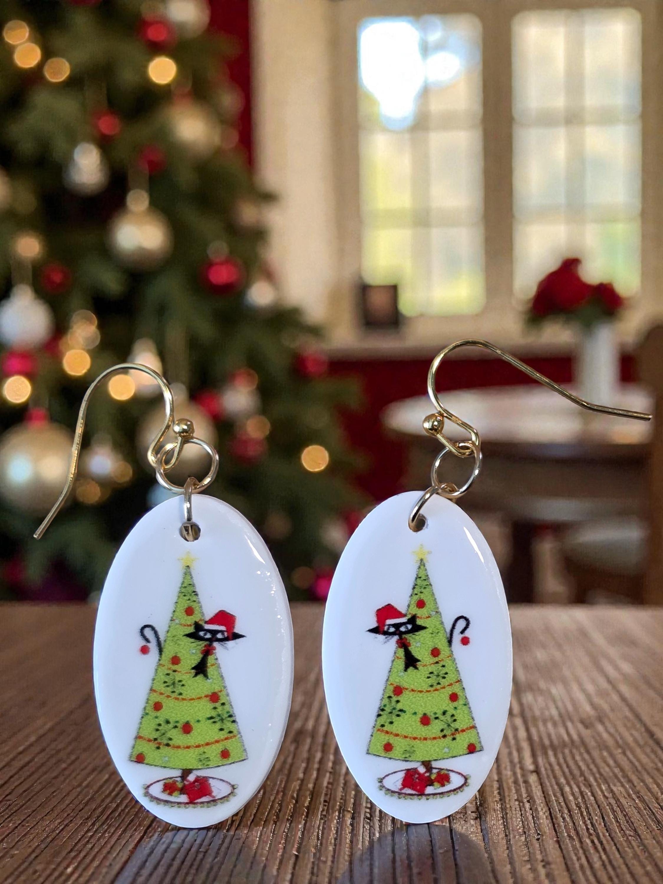 Celebrate the season with these festive, funny (and often naughty) Christmas Atomic Cats! These delightful holiday cats are my own original artwork, now featured on handmade earrings for a playful mid-century Christmas look.