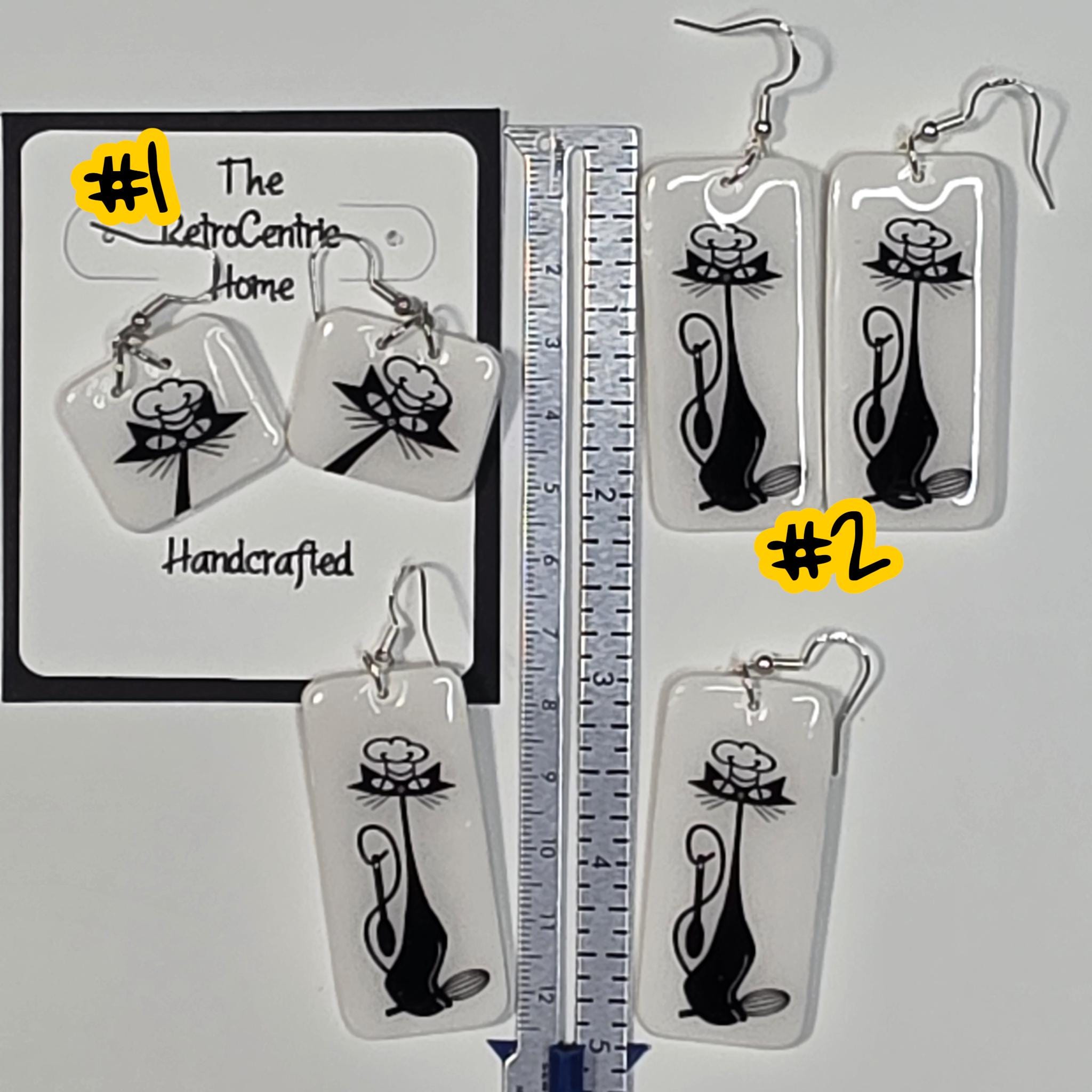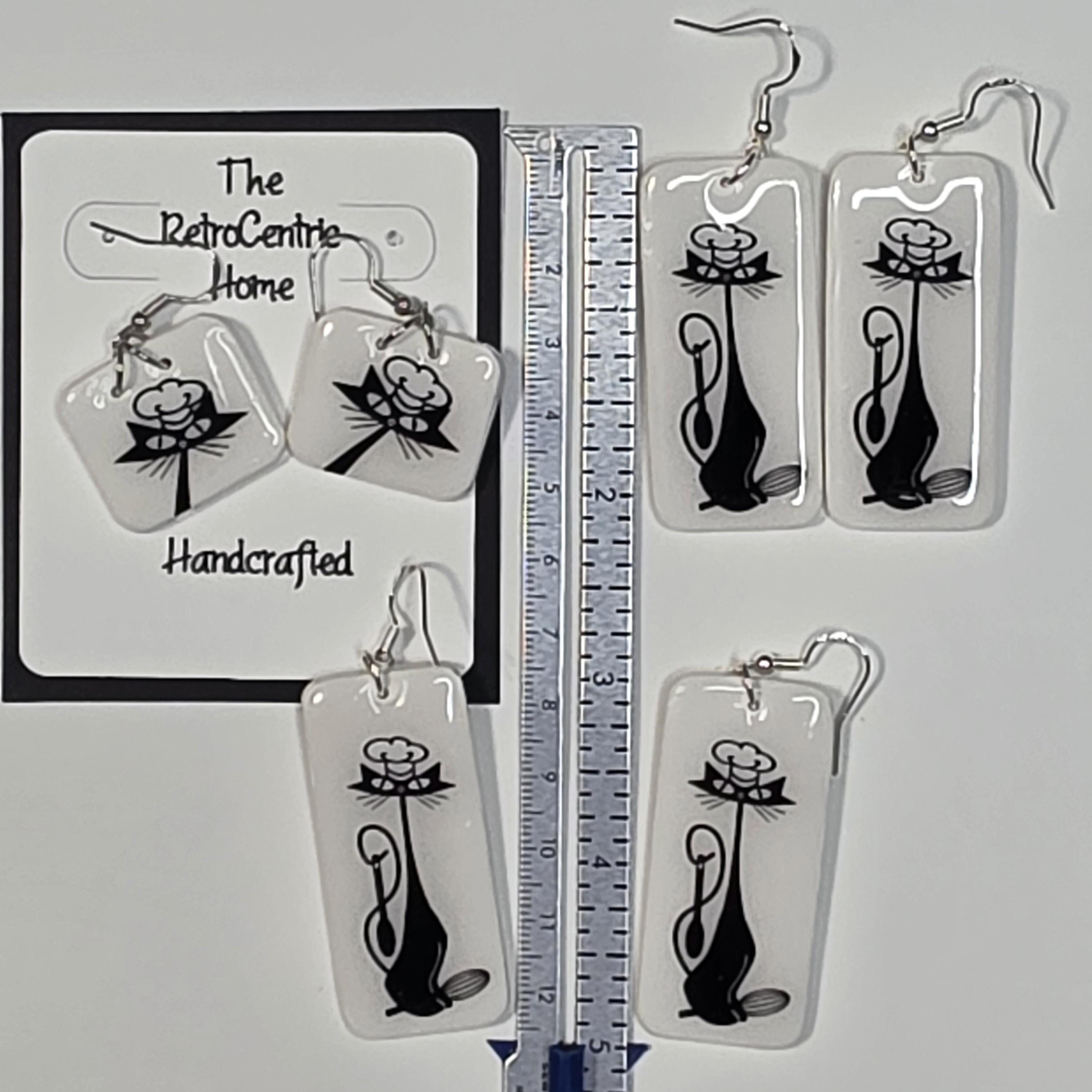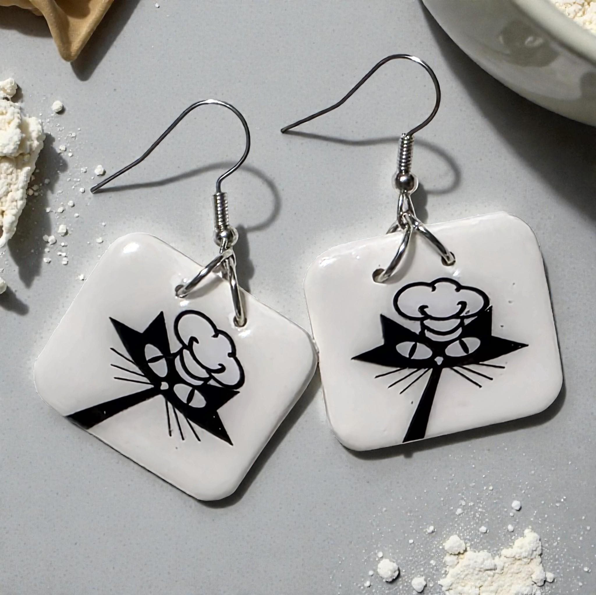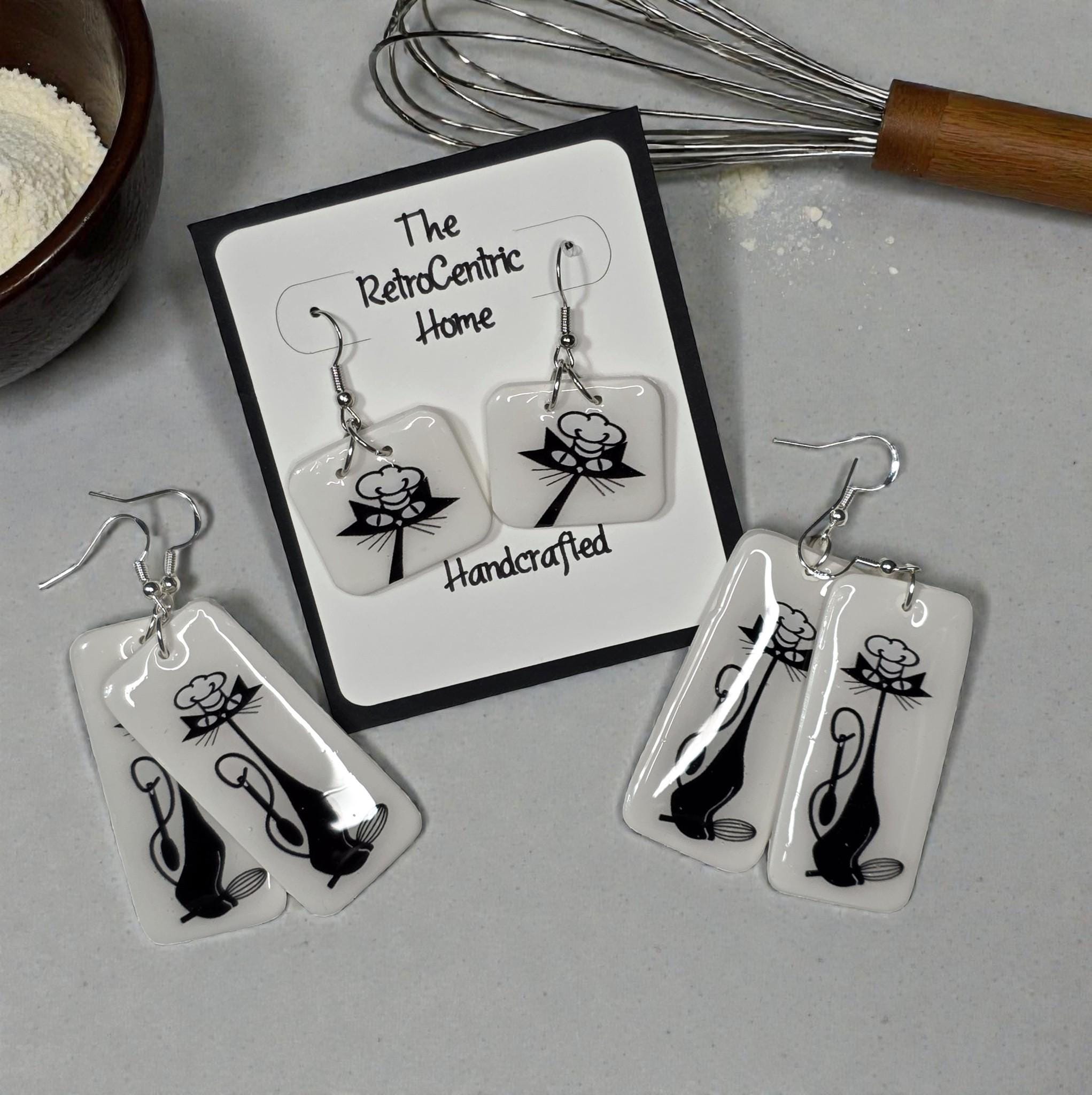 These fabulous and funny atomic cats are my own original creations, and we’re thrilled to feature them on earrings! Each pair is lovingly handmade, making them a perfect choice for anyone who appreciates quirky mid-century style and truly unique art. Here we have our 'Chef' 'Baker' 'Cook' cat for you to wear and love.